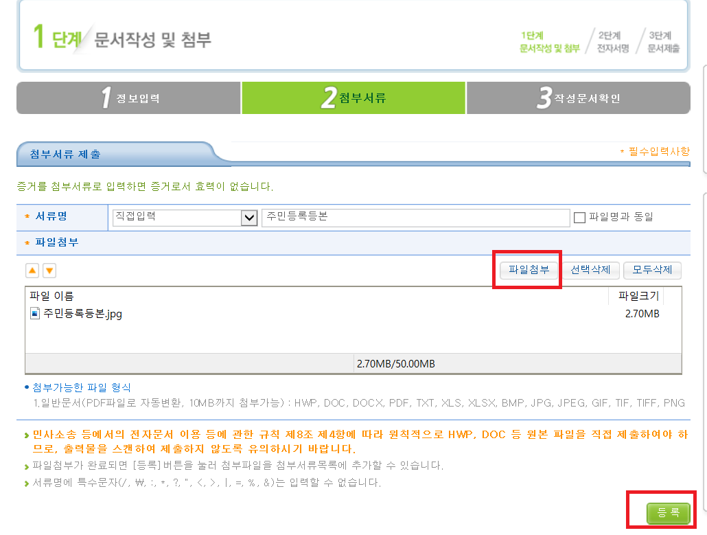 - 서류명 직접입력 : 주민등록(등)초본 등록