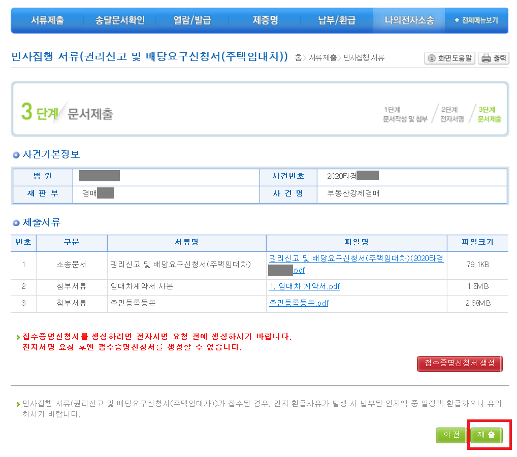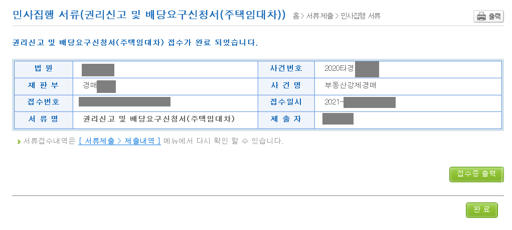 권리신고 및 배당요구 신청서 제출 방법 아래와 같습니다.