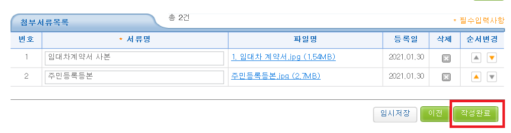 - 파일이 정상 등록되어는지 확인 후 작성완료