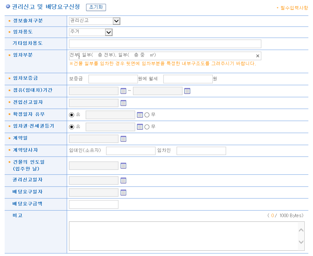 - 권리신고 및 배당요구신청 취지 내용은 기본으로 문구 등록되어 있습니다.