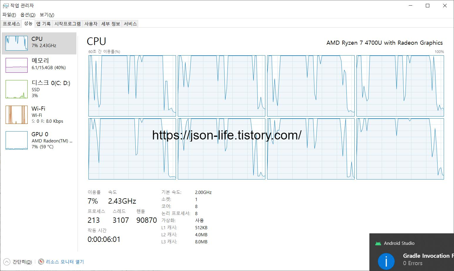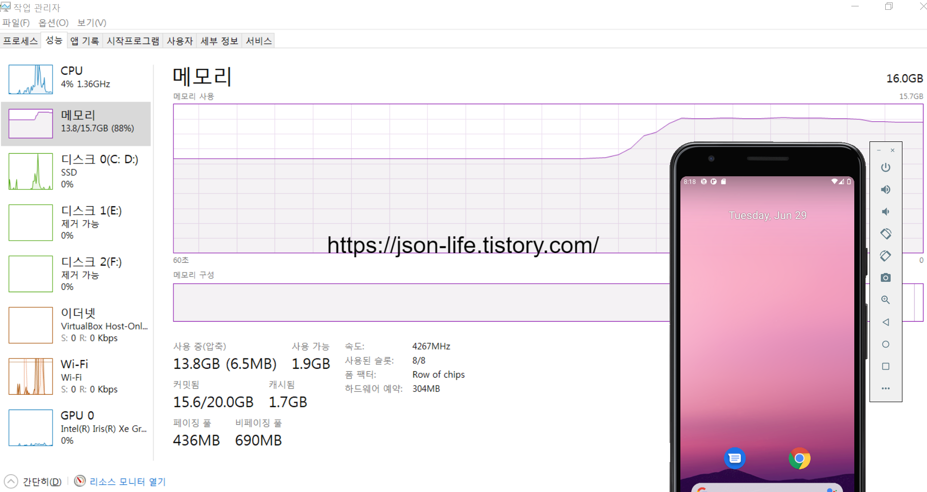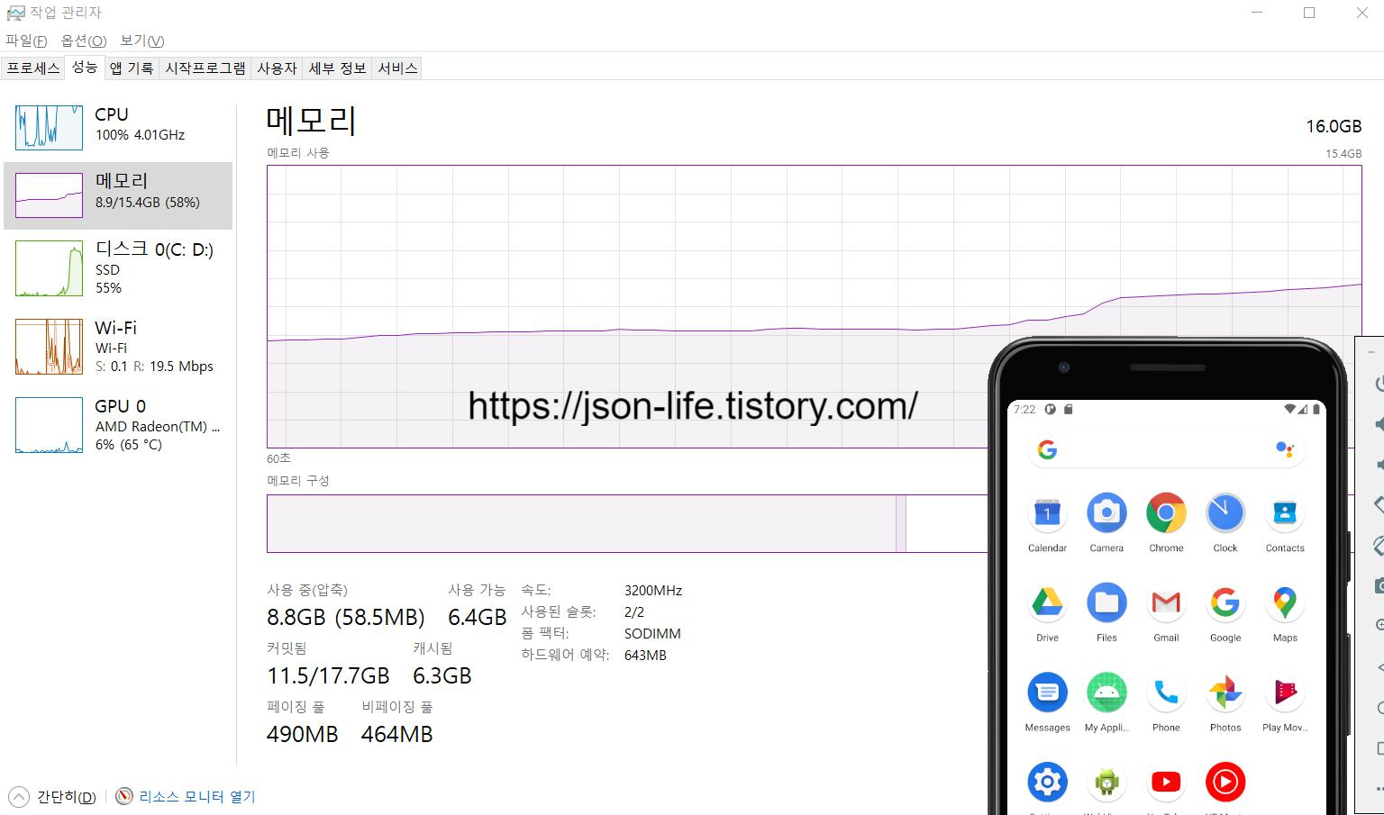 5. 메모리 테스트 (안드로이드 스튜디오 프로젝트 5개 실행, 애뮬레이터 1개 실행)