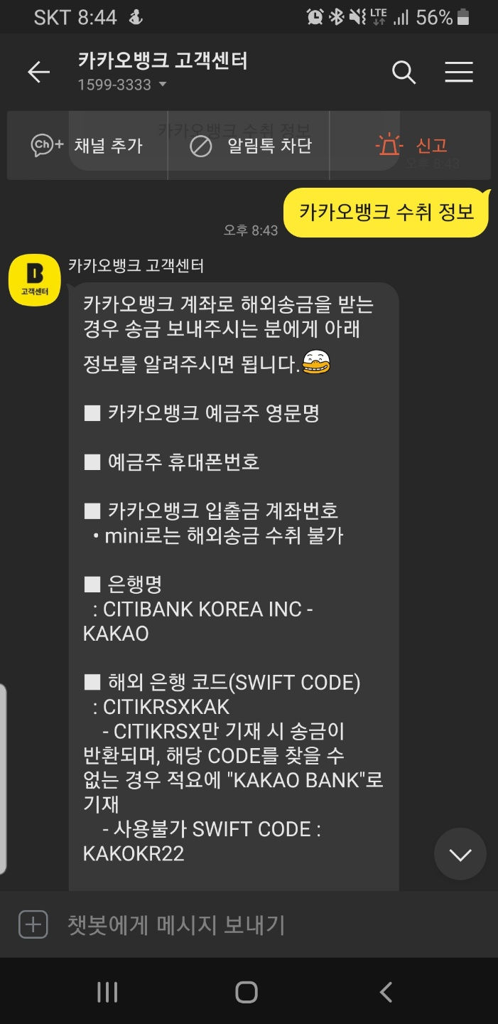 2. "카카오뱅크 수취 정보" 채팅 입력